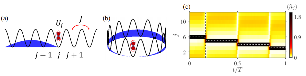 李朝红-柯勇贯课题组在具有共同平移对称性的多粒子体系中首次发现了相互作用诱导的连续谱中的多粒子束缚态,并利用拓扑泵浦来动态调控连续谱中的多粒子束缚态。不失一般性,课题组考虑具有时间和空间周期调制相互作用的玻色-哈伯德模型。在开边界条件下,连续谱中的三粒子束缚态表现为两粒子束缚对局域在单粒子驻波的一侧[图(a)]。在周期性边界条件下,强相互作用导致了平坦的三粒子能带,通过构建多粒子万尼尔态可以得到连续谱中的三粒子准束缚态,其表现为两粒子束缚对局域在单粒子驻波的波节处[图(b)]。由于连续谱中的三粒子准束缚态是近简并的多粒子布洛赫态的等概率叠加态,近似为本征态,在相当长的时间内保持稳定。将连续谱中的三粒子准束缚态作为初态,通过动态改变相互作用可以实现其动力学调控[图(c)]。经过一个泵浦周期,三个粒子整体上移动了一个原胞的长度,与其对应的多粒子能带的拓扑不变量一致。令人惊讶的是,在泵浦过程中单粒子流动方向与两粒子束缚对流动方向相反。这是一种新的多粒子拓扑泵浦模式,完全不同于课题组之前预言的并被实验证实的束缚态的拓扑泵浦以及拓扑共振隧穿。在之前的关联拓扑泵浦中,所有粒子的运动方向相同。这些结果揭示了一般的相互作用多体系统中广泛存在连续谱中的多粒子束缚态,并提供了连续谱中多粒子束缚态的动力学调控方案,为系统地寻找连续谱中的多粒子(准)束缚态及其调控和应用铺平了道路。