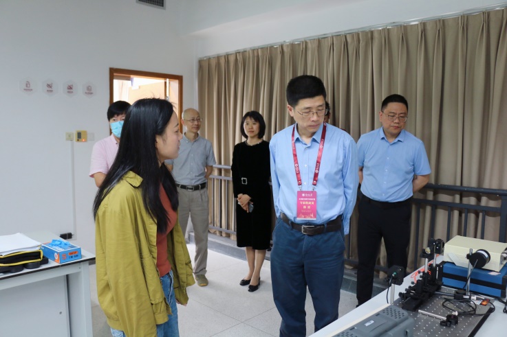 在陪同人员的指引下,徐雷一行先后实地观摩了位于致原楼7楼的光电教学实验中心、本科学生创新实验室(创新部)和大学物理实验中心。相关负责人详细介绍各个实验室仪器设备的工作原理及其应用,并针对徐雷的提问进行深入细致的解答。扎实的专业知识、谨严的工作态度、清晰的言语表达给专家们留下深刻印象。
