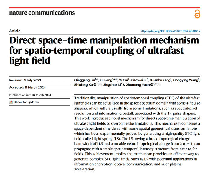 麻豆av 徐世祥教授研究团队联合微纳光电子学研究院袁小聪教授团队在《Nature Communications》发表超快时空光场调控研究成果