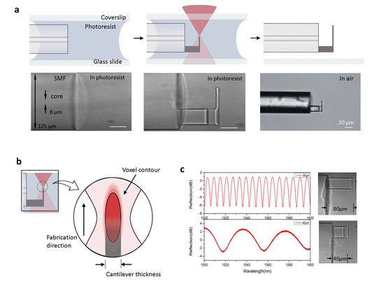 在这项工作中,我们提出基于光纤的纳米振动传感器,其原理是光纤端面和悬臂梁组成的法布里-珀罗 (FP) 干涉仪在活体微生物悬臂梁振动,改变了它们的光程差导致干涉动态变化。它的灵敏测试核心是通过双光子聚合 (2PP) 技术将柔性 3D 打印超灵敏悬臂梁。我们在垂直方向实施2PP打印以实现更薄的悬臂 最终厚度为1微米左右。此外,飞秒激光的相对较低功率和聚合过程中相对较快的扫描速度使得聚合结构的与其杨氏模量相关的固有刚度较低,从而增大了悬臂梁的弹簧常数和检测灵敏度。悬臂梁的弹簧常数低至约 0.3 N/m 商用氮化硅 AFM 悬臂处于同一数量级。作为概念验证原,我们证明了这种基于光纤的纳米振动传感器在大肠杆菌和白色念珠菌分别对抗生素和抗真菌药物的实时敏感性测试中显示出优异的性能,检测出它们代谢活动引起的纳米或亚纳米悬臂振动。这种兼具快速响应和并行化优势的纳米振动传感器策略可能会推动该技术成为下一代纳米振动传感器,用于大规模和快速的抗菌敏感性测试以及其他技术和生物医学应用。