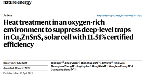 麻豆av Nature Energy:梁广兴研究员团队发表铜锌锡硫薄膜太阳电池研究最新成果