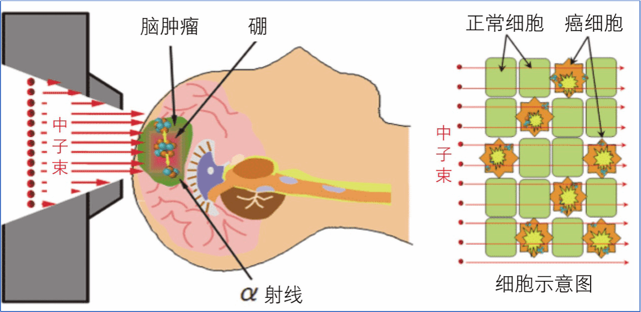 BNCT(硼中子俘获治疗)是一种结合含硼靶向药物和重离子治疗的新型二元肿瘤放射治疗方法,可实现细胞尺度的精确治疗,已成为目前世界上最先进的肿瘤治疗手段之一。其原理是将携带10B(一种稳定无放射性的天然同位素)的靶向分子药物注射到人体,靶向药物的选择性使10B高特异性地集聚在肿瘤组织内(生物导向),再通过具有指向性的低能量超热中子束对肿瘤部位进行外照射(物理定向),使肿瘤组织内10B被激活、并发生硼中子俘获作用放出α粒子和7Li粒子破坏肿瘤组织。释放的7Li粒子的射程约为4-5μm,α粒子的射程约为9-l0 μm,而肿瘤细胞的直径一般小于10μm,所以该方法的辐射杀伤范围仅局限于肿瘤细胞内,对周围正常组织的损害极小,因此处于治疗中的患者无需要特殊防护。