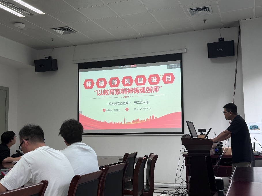 2024年9月-10月,各教工党支部开展师德建设月学习,通过学文件、学规则制度,观看师德视频,开展学习。院部党支部于9月24日下午在致原楼1421会议室召开支部党员大会,开展师德专题学习。学习了习近平同志《论教育》、习近平总书记在全国教育大会上的讲话(2024年9月)、中共中央国务院关于弘扬教育家精神加强新时代高素质专业化教师队伍建设的意见等。全体与会人员表示深刻领会本次师德师风集中学习会议精神,充分认识师德师风建设的重要性,坚定理想信念、筑牢思想防线,以身作则,立足本职岗位,严格遵守教师职业准则;10月11日下午,二维材料实验室第一、二党支部组织党员集中学习了师德建设相关内容。张启涛开讲“以教育家精神铸魂强师”的党课。一是讲解了教育家精神的内涵,可以从“报国”、“育人”、“弘道”这三方面来理解,二是从师德构成、三大特点、新时代师德师风的“三大变化”讲解如何涵养高尚师德师风,三是告诉党员教师要弘扬教育家精神,争做新时代“四有”好老师。